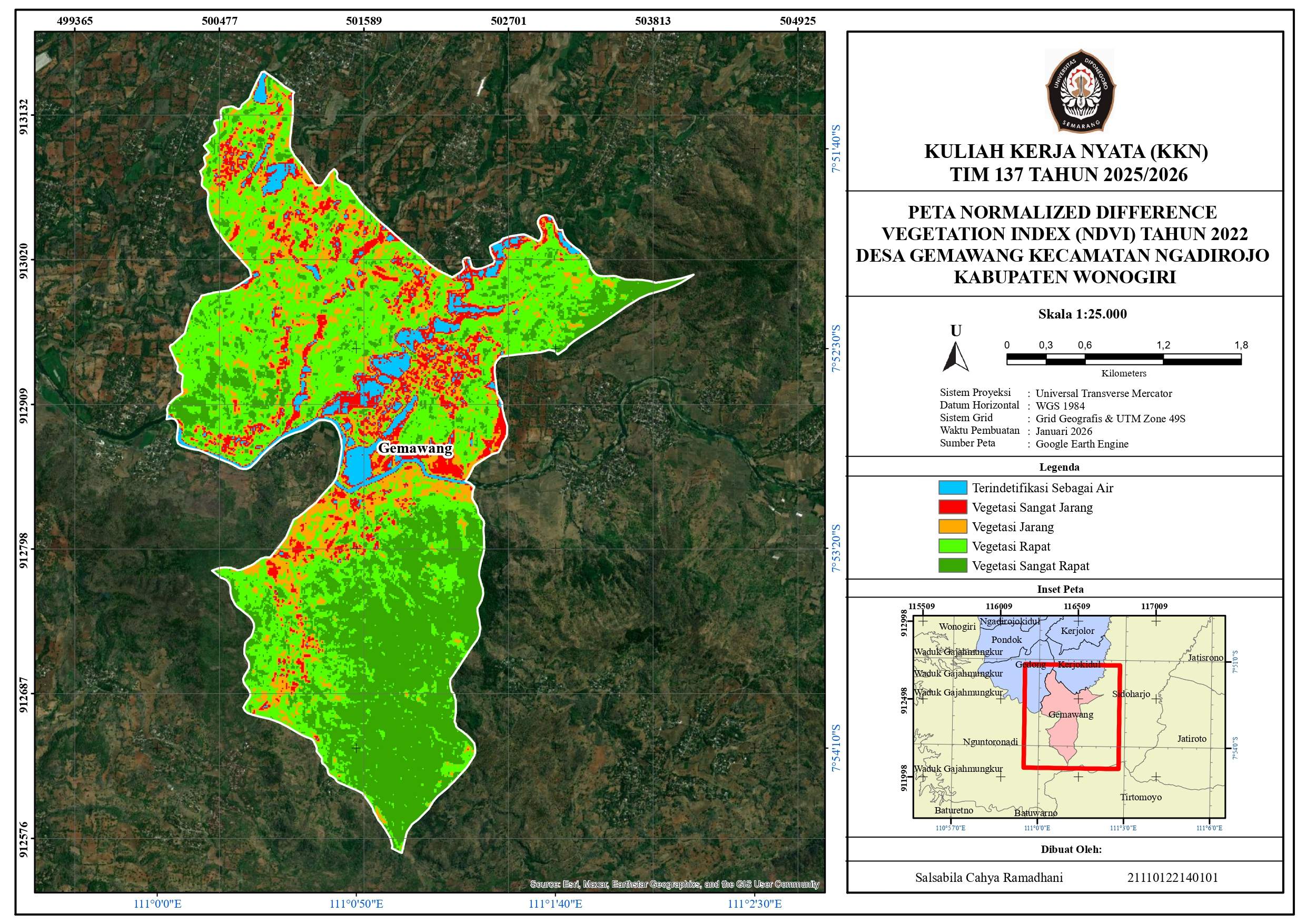 Jatengx.com, Wonogiri – Program monodisiplin pemetaan Normalized Difference Vegetation Index (NDVI) yang dilaksanakan oleh mahasiswa KKN Universitas Diponegoro, Salsabila Cahya Ramadhani dari Program Studi Teknik Geodesi UNDIP, di Desa Gemawang, Kecamatan Ngadirojo, Kabupaten Wonogiri, merupakan upaya pemanfaatan teknologi penginderaan jauh untuk mendukung pemahaman dan pemantauan kondisi vegetasi desa secara spasial.