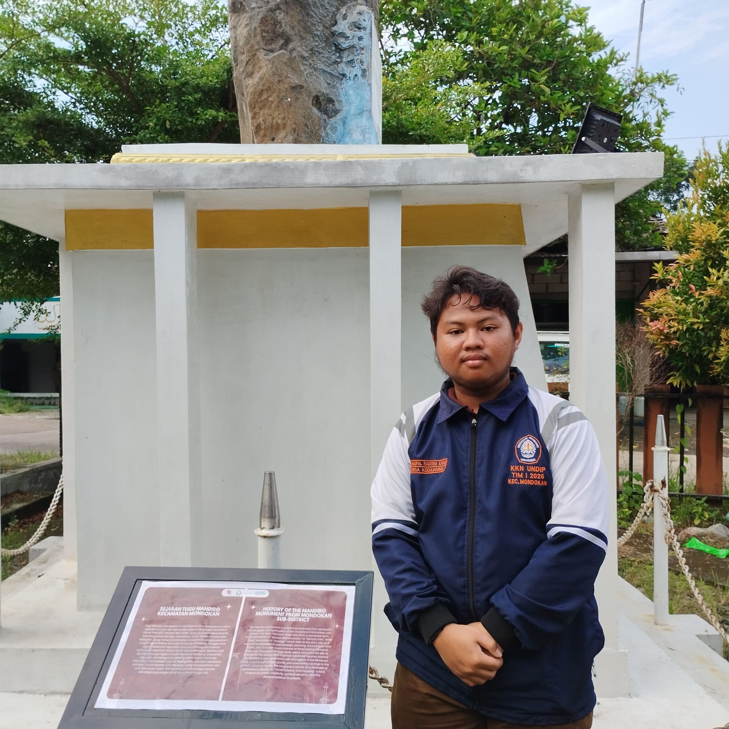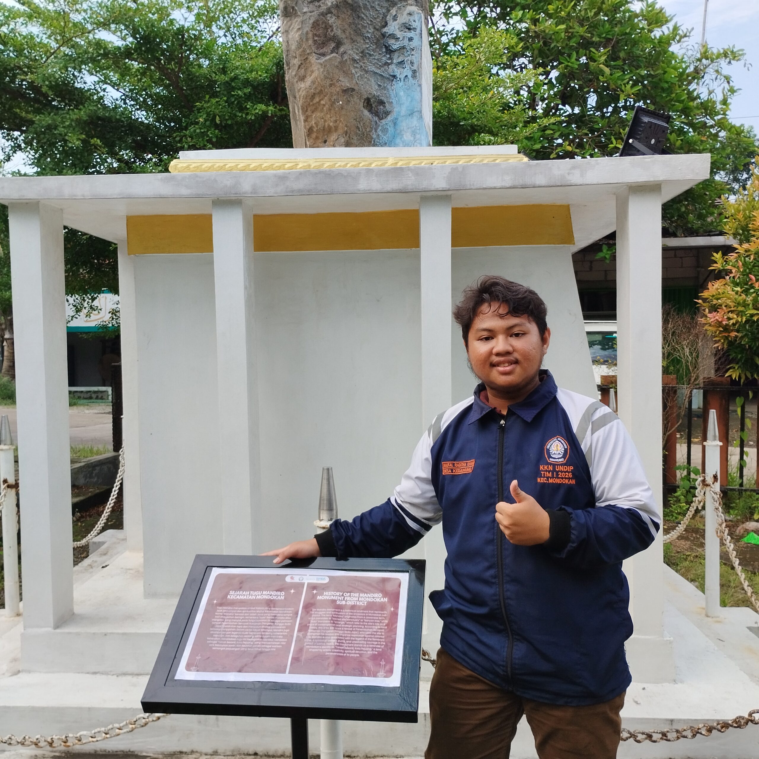 Jatengx.com, Sragen – Mahasiswa Kuliah Kerja Nyata (KKN) Universitas Diponegoro, Prodi Sastra Inggris, Naufal Raditha Ilham, telah melaksanakan program kerja Mutidisiplin 2, pemasangan plang besi berisi sejarah Tugu Mandiro yang disajikan dalam dua bahasa, yaitu Bahasa Indonesia dan Bahasa Inggris. Program kerja ini bertujuan untuk menghadirkan media informasi yang edukatif sekaligus menarik bagi masyarakat dan pengunjung. Plang besi terebut tidak hanya berfungsi sebagai hiasan semata, tetapi juga sebagai sarana pengenalan bahasa asing yang kontekstual dan mudah dipahami.